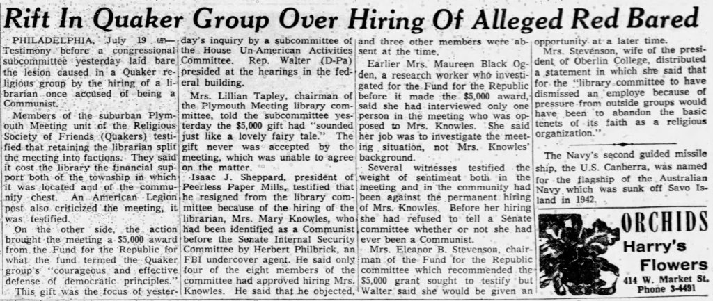 With her reputation tarnished, Mary moved with her son Jonathan to Philadelphia. She had divorced in 1951, a change that only added to the challenges she faced. She eventually landed a temporary job at the William Jeanes Memorial Library, located right on the grounds of the Plymouth Friends Meeting House. Founded in 1926 by Mary Rich Jeanes Miller in memory of her first husband, the library was overseen by a board appointed by the local Quaker meeting. By 1953, however, it relied heavily on public funding. Mary was hired to fill in for librarian Edith Sawyer, who had broken her hip.